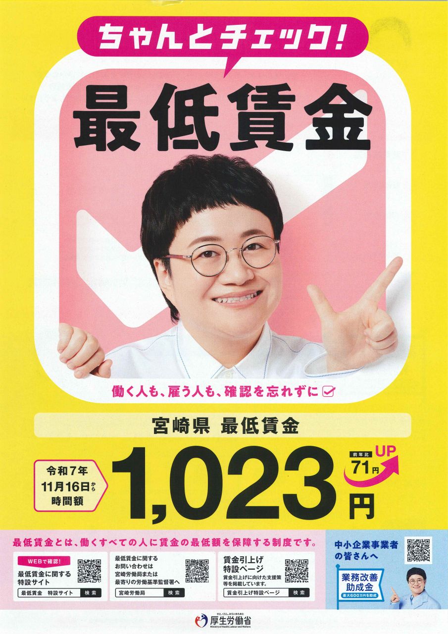 宮崎県最低賃金は、本年、11月16日から「時間額1,023円」に改定されることになりました。 最低賃金は、臨時、パート、アルバイトを含む宮崎県内で働くすべての労働者に適用されます。【お問い合わせ先】 宮崎県労働局労働基準部 賃金室 TEL 0985-38-8836 まで
